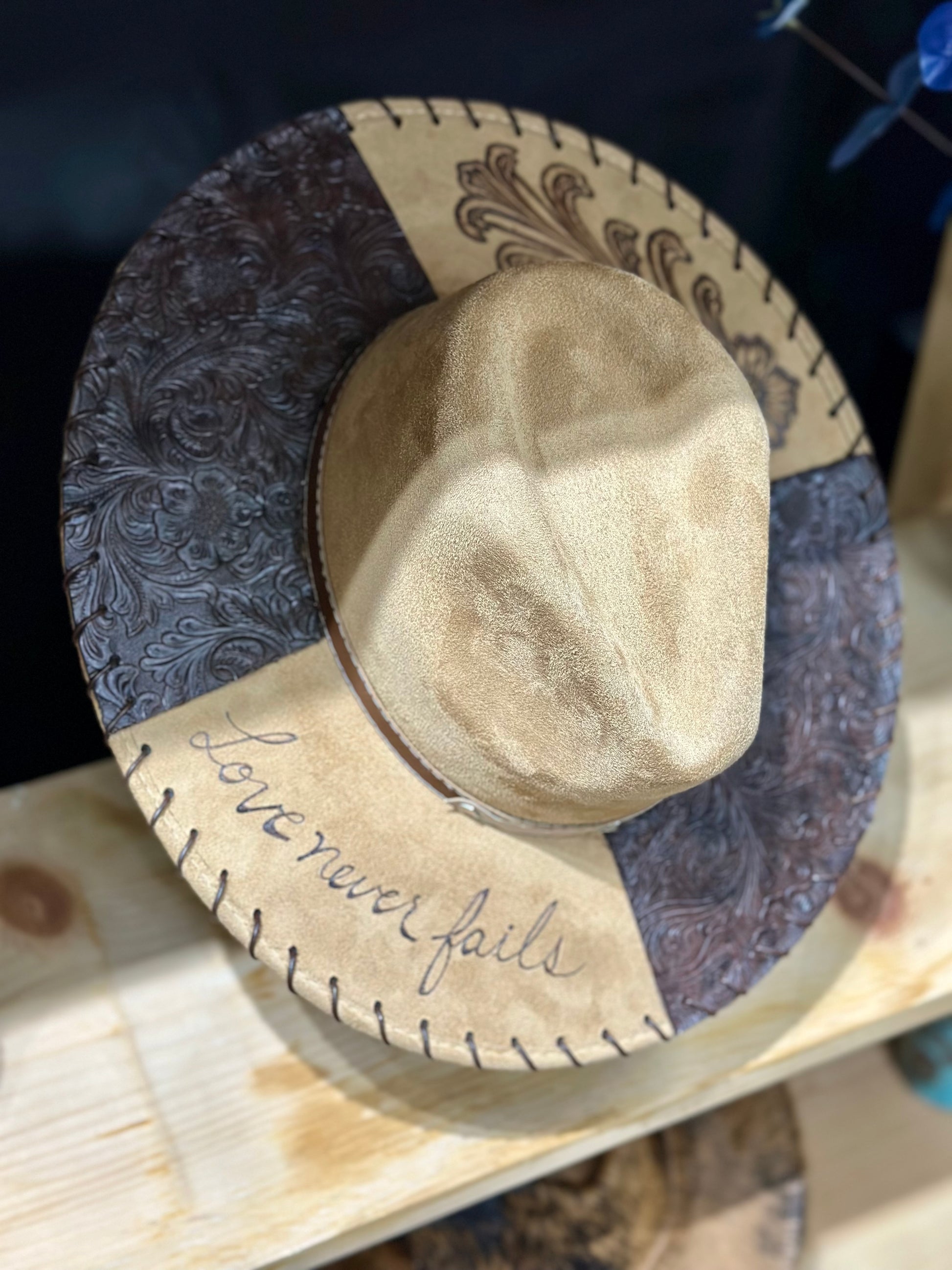 Love Never Fails Fedora Wide Brim Hat with Burned Design